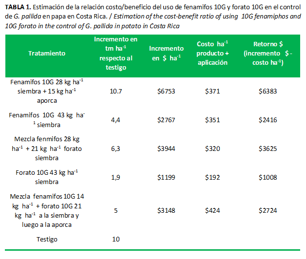 El costo del control por hectárea, incluida la aplicación, fue de $351 cuando se usó fenamifos; $192 para forato y $320 cuando se usó la mezcla de ambos, todos aplicados a la siembra (Tabla 1). La aplicación de fenamifos a la siembra y la aporca costó $371 .ha-1 y cuando se aplicó la mezcla de productos a la siembra y a la aporca el costo fue de $424 .ha-1. El incremento promedio en papa comercializable de los tratamientos nematicidas, respecto al testigo sin aplicación, fue de 5,6 t. ha-1 (56 %) con dosis que variaron de 43 a 70 kg. ha-1 ($192-$424 ha-1) de producto comercial. El precio promedio de venta de papa al por mayor para el año 2012, según el PIMA, fue $643. t-1, para una ganancia promedio de $3263 .ha-1 para las 5,6 t.ha-1 (Tabla 1). En el mejor tratamiento, la ganancia neta fue de $6383.