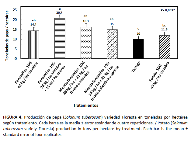 En promedio, los tratamientos nematicidas superaron (P= 0,0537) al testigo en 5,6 toneladas y el fenamifos a la siembra y la aporca, y la mezcla de fenamifos-forato a la siembra lo superaron en 10,7 (P= 0,0131) y 6,2 (P= 0,0537) toneladas por hectárea, respectivamente (Fig. 4A-B).