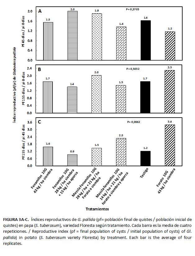 No se encontró diferencia (P> 0,0662) en el índice reproductivo (Pf=población final de quistes/Pi= población inicial de quistes) a los 45 días (Fig. 3A), 155 días (Fig. 3B) ni cuando se estimó a partir de pf 155 días/pi 45 días (Fig. 3C). Sin embargo, comparado con el testigo, en las parcelas tratadas con fenamifos, aplicado a la siembra y la aporca, se observó 25 % de reducción en la población de quistes de los 45 a los 155 días después de la siembra, resultando en el menor crecimiento de la población.