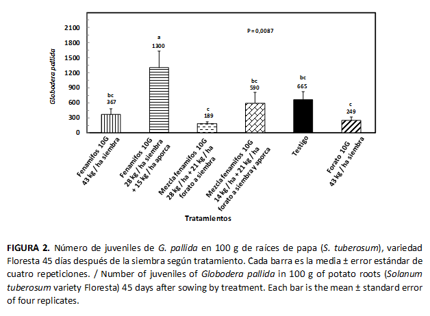A los 45 días de la siembra, las plantas de las parcelas tratadas con la mezcla fenamifos–forato presentaron la menor (P= 0,0087) población de juveniles, con 189 individuos por 100 g de raíces (Fig. 2). En las raíces también se detectó Pratylenchus spp., la población varió de 45 a 90 en las plantas tratadas con cualquiera de los nematicidas, mientras que en el testigo alcanzó 120 individuos por 100 g de raíces (datos no presentados).