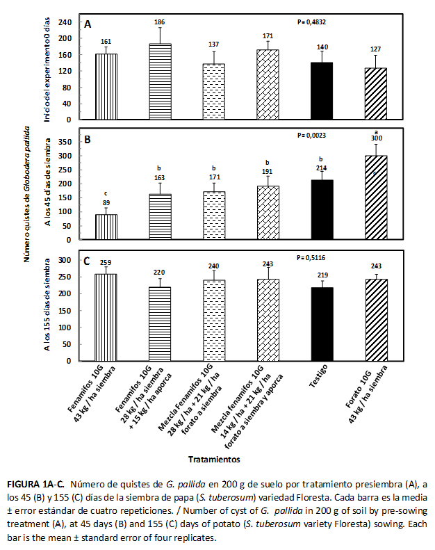 La población inicial de quistes en el área experimental fue similar entre tratamientos (P= 0,4832), oscilando de 127 a 186 quistes por 200 gramos de suelo (Fig. 1A). A los 45 días de la siembra se encontraron diferencias (p= 0,0023) entre tratamientos en el número de quistes. Las parcelas tratadas con fenamifos a la siembra presentaron la menor cantidad con 89 quistes, comparado con el testigo con 191 quistes (Fig. 1B). A la cosecha (155 días de la siembra) no se observó diferencia (p= 0,5116) en el número de quistes, variando de 219 a 259 quistes por 200 gramos de suelo. (Fig. 1C)
