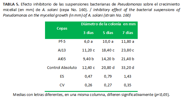 Las suspensiones bacterianas de las tres cepas de Pseudomonas mostraron un efecto inhibitorio sobre A. solani, aun sin estar en contacto con el patógeno. Los metabolitos producidos por la cepa Pf-5 provocaron la mayor inhibición del crecimiento del hongo (Fig.5), con diferencias significativas con respecto al resto de los tratamientos. Aun cuando los resultados obtenidos con la cepa AJ13 fueron diferentes significativamente a los del control a partir del quinto día, en esta cepa se alcanzó la menor inhibición (Tabla 5).