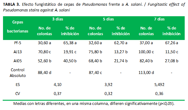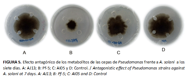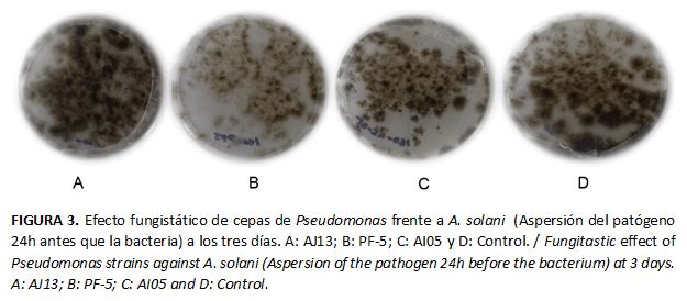 Pseudomonas fluorescentes pueden ser utilizadas como agente de control biológico, ya que tienen la capacidad de inhibir el crecimiento de fitopatógenos en condiciones in vitro. La cepa de P. protegens PF-5 tiene efecto inhibitorio, fungicida y fungistático sobre A. solani, lo que demuestra sus potencialidades y las diferencias entre las cepas estudiadas en cuanto a sus mecanismos de acción. No obstante, deben realizarse otros estudios a escala de campo para comprobar los verdaderos efectos de esta cepa en el control de la plaga y el manejo integrado de la enfermedad en el cultivo de la papa.
