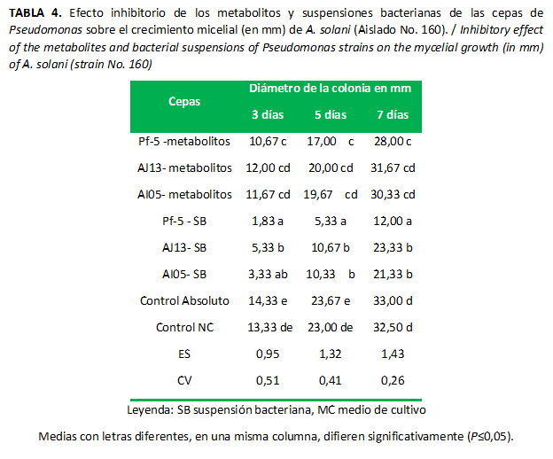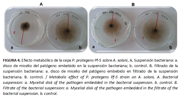 De manera general, se encontró que solo los metabolitos de la cepa Pf-5 produjeron un efecto inhibitorio significativamente diferente a los controles analizados, aun cuando no se encontraron diferencias significativas entre el efecto causado por todas las cepas bacterianas (Tabla 4). El análisis del efecto provocado por las suspensiones bacterianas sobre A. solani mostró diferencias significativas para todas las cepas respecto a los controles y nuevamente se destacó la cepa Pf-5. Los tratamientos donde se utilizaron las cepas tuvieron un mejor efecto que aquellos donde se utilizaron los metabolitos (Fig. 4), con diferencias significativas entre sí.