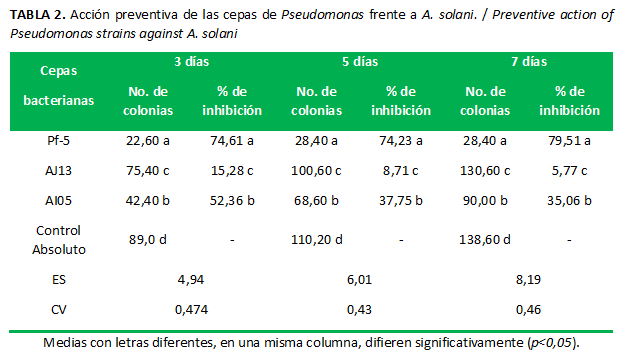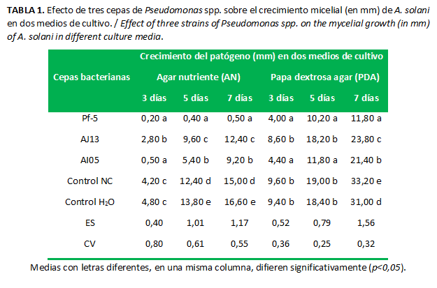 Las cepas de Pseudomonas spp. inhibieron el crecimiento de A. solani en el medio de cultivo AN, con diferencias significativas respecto a los controles en todos los momentos de evaluación (Tabla 1). En el medio PDA también se observó efecto inhibitorio, con la excepción de la cepa AJ13, cuyo efecto tuvo diferencias significativas solo el séptimo día de la evaluación, con respecto a los controles. En ambos medios de cultivo, de forma general, P. protegens cepa Pf-5 mostró el mejor comportamiento al compararla con las otras dos cepas.