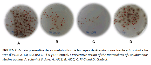 Acción preventiva de las cepas de Pseudomonas frente a A. solani