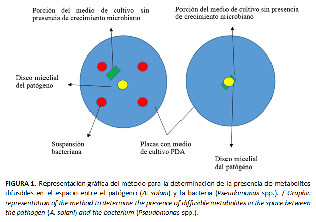 Se demostró que en el espacio existente en la placa, entre el patógeno y la cepa PF-5, hubo presencia de metabolitos difusos en el medio de cultivo, pues lograron disminuir el crecimiento del patógeno sobre el disco procedente de dicha zona (Fig.6). En la literatura consultada no se encontraron antecedentes del análisis de los modos de acción de esta bacteria para el control de A. solani.