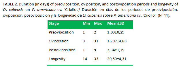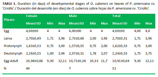 A very favorable outcome for the biotic potential of the species was the fact that no mortality was found for immature stages. This element is remarkable if it is considered that O. yothersi had a 53 % mortality, with the highest mortality in the larval stage (36 %) (13), while the percentage of survival determined for O. punicae on cv. 'Fuerte', 'Hass' and, 'Criollo' was of 80, 85 and 75 %, respectively (18). This indicates that O. cubensis can reach high populations under favorable conditions of high temperature and low relative humidity.