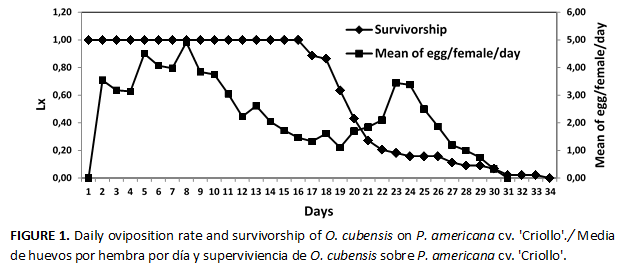 The values found for O. cubensis are similar or superior to those reported for O. yothersi on the cultivar 'Lorraine', where the preoviposition period was of 1.09 days, with 6.64 days for the oviposition period and a longevity of 8.35 days. The fecundity mean was 14.43 eggs/female (13).