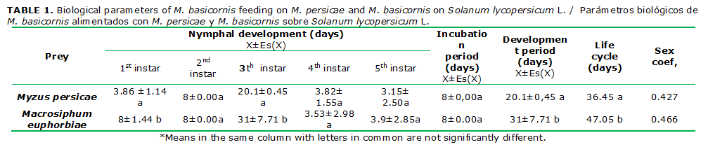 Regardless of the prey supplied, the predator egg incubation period on tomato plants was eight days. Similarly, the predator post-embryonic development included five nymphal stages feeding on each prey, each stage with a maximum duration of eight days. However, when M. persicae was supplied as a prey, an extra day was added to predator´s fifth nymphal stage. Nevertheless, when M. euphorbiae was supplied as a prey, the predator´s first nymphal stage reached eight days, consequently resulting in a longer nymphal development. With both preys, the stadiums of interest (fourth and fifth) were achieved in three days. The development and life cycles of the predator showed significant differences with both preys, being longer when M. euphorbiae was the prey. In both cases, the life cycle duration was longer than one month. Therefore, considering this time and depending on the prey consumed, several annual predator generations per year can be possible, ranging from ten (on M. persicae) to seven (on M. euphorbiae). (Table 1)