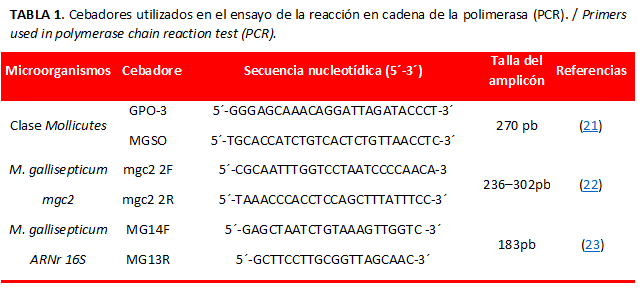Para la realización de cada ensayo se resuspendieron las muestras de ADN deshidratado en 20 µl de agua libre de nucleasas. Para la amplificación de los fragmentos de los genes ARNr 16S de Mollicutes, ARNr 16S y mgc2 de M. gallisepticum se siguieron los protocolos descritos por Van Kuppeveld (21), Lauerman (22) y Hnatow (23), respectivamente. La Tabla 1 relaciona la secuencia de los cebadores utilizados en estos ensayos.
