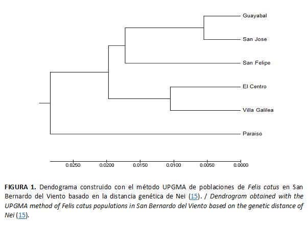 En el dendograma elaborado a partir de los valores de distancia genética de Nei (22) para las seis poblaciones de San Bernardo del Viento se aprecia que la cercanía génica responde a la vecindad geográfica y a la antigüedad de los barrios, donde se presume que arribaron los primeros gatos a la población (25).