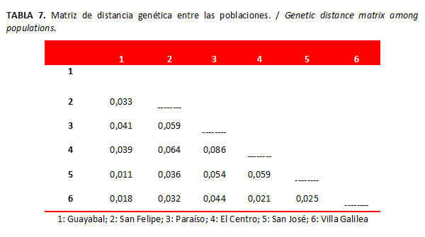 La distancia genética entre las poblaciones de San Bernardo del Viento reveló a Guayabal y San José como las poblaciones más cercanas (Tabla 7), mientras que El Centro y Paraíso mostraron ser las de mayor divergencia genética, pero con valores poco significativos, pues estos no superan el 9 %.