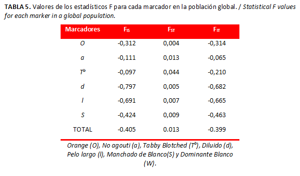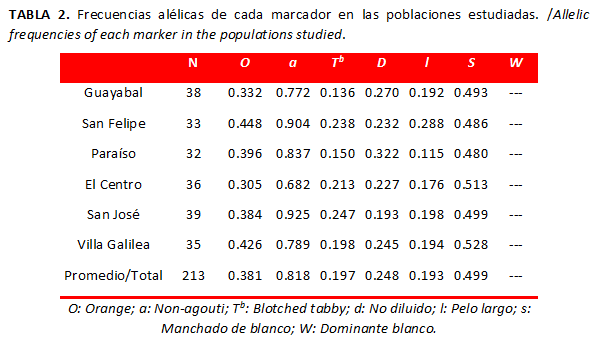Se observaron 213 especímenes. Al determinar las frecuencias alélicas para cada población (Tabla 2) se encontró que el fenotipo Non-agouti fue el más frecuente, principalmente en las poblaciones de San José (q=0. 0.925) y San Felipe (q=0. 0.904). El gen Dominante blanco, responsable de la capa blanca, no se registró en las poblaciones y este fue el marcador menos frecuente en la población de San Bernardo del Viento. Asimismo, los marcadores pelo largo y Blotched tabby mostraron frecuencias bajas, tanto a nivel poblacional como a nivel global (Tabla 2). Es importante señalar que la frecuencia del gen Manchado de blanco fue alta (p=0.499), si se compara con las reportadas en otras poblaciones.