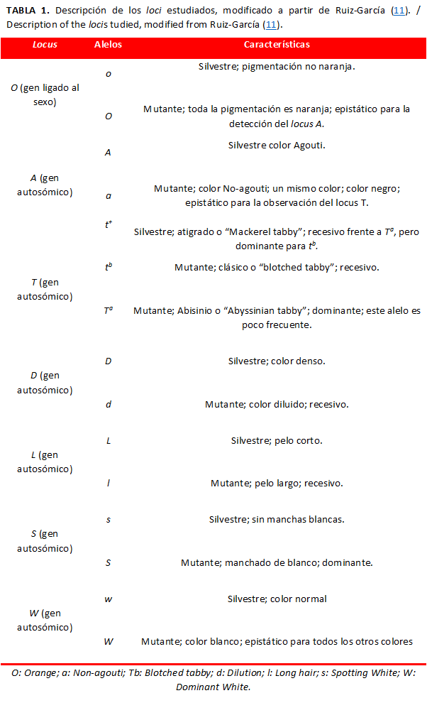 Para el estudio del perfil genético de las poblaciones de gatos domésticos (Felis catus) se tuvieron en cuenta marcadores fenotípicos (Tabla 1) propuestos por el Committee on Standardized Genetic Nomenclature for Cats (12): O (Orange: Carácter ligado al sexo) y los loci autosómicos, A (A, a; agouti vs. non-agouti), T (Ta, t+, tb; Abyssinian tabby vs. mackerel vs. Blotched tabby), D (D, d; full color vs. Dilution, L (L, l; pelo corto vs. pelo largo), S (s, S; no manchado de blanco vs. manchado de blanco) y W (w, W; color normal vs. Dominante blanco).