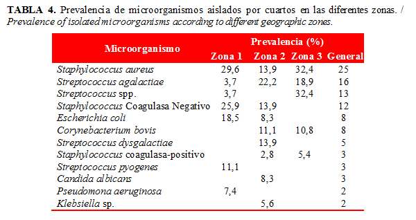 El índice de mastitis subclínica en las zonas de estudio (Figura 2) coincide, aunque ligeramente por debajo, con los valores de 1,42 y 1,62 encontrados en investigaciones previas realizadas en la provincia Villa Clara (18). Estos valores se encuentran por encima de lo que se considera correcto, que es de 0,5, manejado como un indicativo epidemiológico en la zona alta de Mérida, Venezuela (11). Estos resultados pudieran estar influenciados por la prevalencia de los patógenos aislados (Tabla 4), principalmente Staphylococcus aureus, Streptococcus agalactiae, Streptococcus spp. y Staphylococcus Coagulasa Negativo con frecuencias 25, 16, 13 y 12 %, respectivamente, sobre el total de cuartos funcionales, seguido de otros gérmenes en menor proporción. En otras provincias de Cuba se reportaron resultados similares (19,20). Es importante considerar que, desde el punto de vista epidemiológico, el 59 % de los gérmenes aislados se encuentra dentro de la clasificación de microorganismos patógenos contagiosos, y los restantes como oportunistas y ambientales (10). Estos valores coinciden con lo reportado en otras investigaciones (8,21,22), que también informan alta prevalencia de estos microorganismos (Tabla 4), por lo que en estos rebaños se debe tener especial atención a las medidas de control de mastitis durante el ordeño, que es el momento de trasmisión de los patógenos contagiosos.