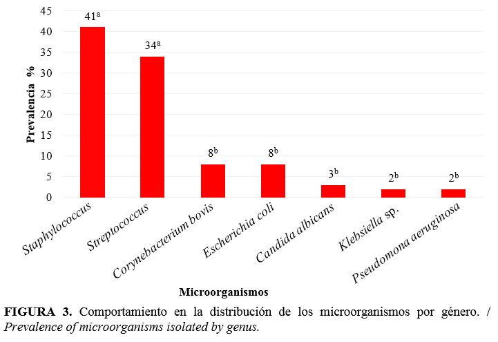 Al realizar un análisis en la distribución de los microorganismos por género se evidenció una mayor incidencia de los géneros Staphylococcus y Streptococcus (41 y 34 %, respectivamente) (Figura 3); el resto de los géneros de microorganismos no supera el 10 %. Estos resultados no coinciden con lo reportado en una investigación realizada en Cienfuegos, Cuba (23), pero sí parcialmente con un estudio nacional donde Staphylococcus fue el género más representativo, seguido de Corynebacterium (19). Este resultado sugiere cierta variabilidad en la etiología general en dependencia de las regiones en estudio. Los resultados se comportan según el consenso de que la mayor prevalencia de microorganismo en la mastitis se concentra en pocas especies; se destacan indistintamente especies de los géneros Staphylococcus y Streptococcus (22,24).