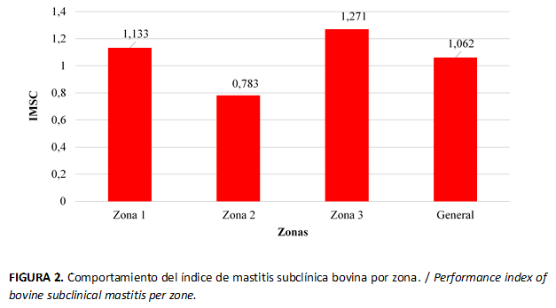 También se determinó el índice de mastitis subclínica (IMSC), el cual considera todas las vacas que están en lactancia y excluyen los cuartos que presentan mastitis clínica en el momento del muestreo y los cuartos ciegos o disfuncionales, lo que permite valorar el estado de la severidad de la enfermedad en su forma subclínica a nivel de rebaño (9,11).