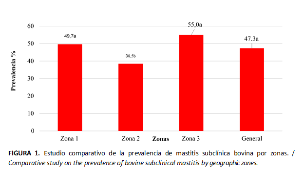 Al analizar los resultados de la caracterización epidemiológica en los rebaños estudiados, se encontró una prevalencia de 47,3 % de mastitis subclínica bovina y una prevalencia de cuartos atrofiados de 3,1 % (Tabla 3). No se observó diferencia estadísticamente significativa entre cuartos sanos y subclínicos. Los cuartos atrofiados y los cuartos subclínicos del máximo de intensidad al CMT sí estuvieron en menor cuantía que el resto de los grados reaccionantes (T, + y ++) (p ≤ 0,05); sin embargo, no existen diferencias entre las zonas 1 y 3 en cuanto al porcentaje de mastitis subclínica, considerando los cuartos positivos a partir de traza (13). Se observaron diferencias significativas (p≤0,05) de estas con la 2, que mostró una prevalencia menor (Figura 1). Lo anterior pudiera deberse a que, aunque el nivel de cumplimiento de los procesos de la cosecha de la leche fue discreto, la zona 2 en estudio sí sobrepasó el 50 %. Esta zona obtuvo mayor puntuación justamente en los dos procesos más críticos, de forma general.