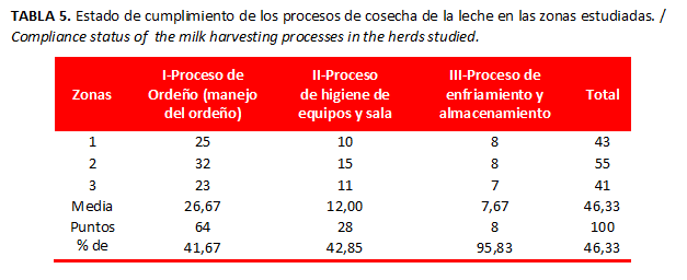 Aunque el nivel de cumplimiento fue discreto, la zona 2 de estudio sí sobrepasó el 50 %. Esta zona obtuvo mayor puntuación justamente en los dos procesos más críticos de forma general (Tabla 5). Este comportamiento está vinculado a que dicha zona muestra una mejor situación en la prevalencia de mastitis subclínica, menor IMSC y menor prevalencia de patógenos S. aureus y Staphylococcus Coagulasa Negativos.