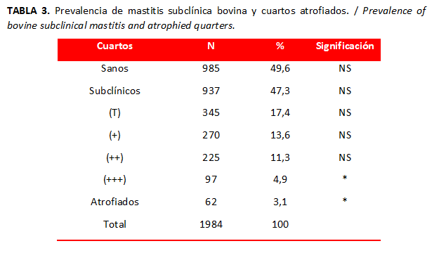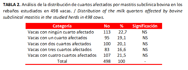 Al realizar un análisis de las distribuciones por número de cuartos afectados por mastitis subclínica bovina por animal, no se observó diferencia estadísticamente significativa. Solo el 22,7 % de las vacas estaba libre de mastitis subclínica bovina, o sea, que el 77,3 % de las vacas tenía al menos un cuarto o más afectado en su distribución numérica; lo que permite inferir que la cifra de vacas afectadas es alta en el rebaño (Tabla 2), valor similar a los 70 % y 72,3 % encontrados en otras investigaciones (9,13). El hecho de que los rebaños tengan esta elevada cantidad de vacas con mastitis es un indicativo de un deficiente control de mastitis contagiosa y de un inadecuado manejo de la mastitis ambiental (14).
