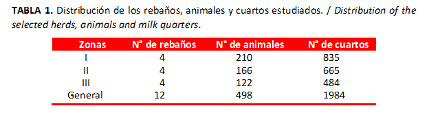La investigación se realizó aleatoriamente en 12 rebaños lecheros pertenecientes a empresas agropecuarias ganaderas de la provincia Villa Clara, los que se agruparon en tres zonas geográficas. Los animales investigados eran mestizos de 5/8 Holstein por 3/8 Cebú, con edades comprendidas entre cuatro y ocho años, y entre cinco y seis lactancias. Los rebaños se sometían a doble ordeño, cuatro manuales y ocho mecanizados, indistintamente. Para detectar glándulas atrofiadas se examinaron individualmente 1984 cuartos (498 animales) (Tabla 1), mediante la observación de la secreción mamaria (prueba de contraste o despunte), así como la inspección y la palpación de la ubre. Se realizó la prueba de california (CMT) a cada cuarto y los resultados se interpretaron de acuerdo a lo establecido; se consideraron procesos subclínicos en presencia de reacción a partir de trazas o positivo débil (9).
