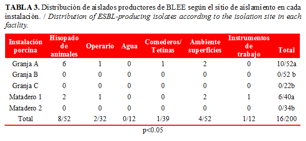 La prevalencia de enterobacterias productoras de BLEEs en la granja A fue de 24,3 % (10/41), en el Matadero M-1 fue de 12,1 % (5/41) y hubo instalaciones donde no se detectaron bacterias productoras de BLEE (granjas B, C y M-2). Una posible explicación a las diferencias encontradas ente las instalaciones investigadas podría ser el consumo de medicamentos en ellas y aspectos de bioseguridad, sin embargo, estos factores no se consideraron en el estudio. Investigaciones realizadas en países europeos demostraron que el uso limitado de antibióticos, la aplicación de estos solamente a animales enfermos en granjas y un alto nivel de bioseguridad se asociaron con una baja prevalencia de enterobacterias productoras de BLEE (52,53). Estos datos enfatizan la necesidad de acompañar los estudios microbiológicos de datos epidemiológicos que revelen las características de cada instalación y la asociación entre estos factores.