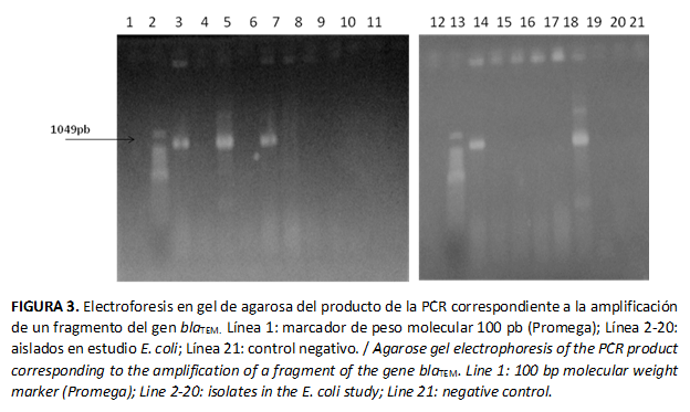 El gen blaTEM se detectó en 5/17 aislados (Figura 3) y el gen blaCTX-M en 15/17, mientras el gen blaSHV no se detectó. Los aislados positivos para el gen blaTEM también lo fueron para blaCTX-M. La ausencia del gen blaSHV coincide con los informes de Lili et al. (15) en el estudio de E. coli procedente de cerdos; mientras que la detección simultánea en un mismo aislado de los genes blaTEM y blaCTX-M concuerda con otros trabajos (37,38,39). El fragmento del gen blaCTX-M se encontró con mayor frecuencia en hisopados rectales de cerdos y en superficies ambientales.