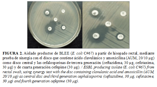 Con la finalidad de detectar BLEE se emplean inhibidores de estas enzimas, usualmente el ácido clavulánico en combinación con cefalosporinas de tercera generación. Este compuesto inhibe a las BLEE y reduce el nivel de resistencia de estas a las cefalosporinas. Un total de 17 aislados mostraron la sensibilidad frente a inhibidores, específicamente a amoxicilina/ácido clavulánico, el cual indujo la aparición de halos fantasmas o a la ampliación del halo de inhibición para las cefalosporinas en la zona cercana al disco que contenía esta mezcla (Figura 2).