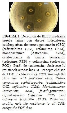 El empleo de discos "indicadores" en la prueba tamiz reveló características específicas de las BLEE y permitió discriminar sobre otros mecanismos de resistencia. El uso del disco de cefamicina (cefoxitina, FOX) descartó a los aislados, en los que la resistencia se debió a deficiencias en las porinas (proteínas de la membrana celular). Los aislados BLEE positivos fueron sensibles a este compuesto, sin embargo, cuando la resistencia se debió a deficiencias en las porinas, la cefoxitina no penetró a las células; en tal caso los aislados se manifestaron resistentes (30,31) y no se consideraron como posibles productores de BLEE.