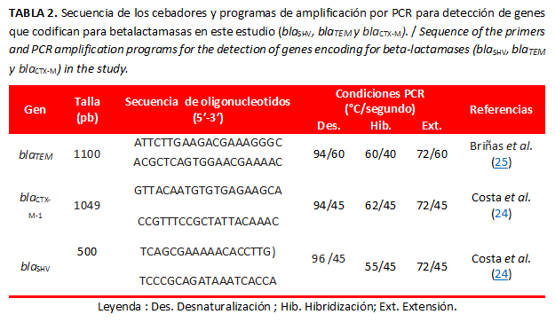 Fueron negativos por PCR dos aislados negativos en la prueba de E-test–cefazidima. La familia de las enzimas betalactamasas de tipo CTX-M es muy amplia y existen numerosas secuencias de cebadores descritas para la amplificación de fragmentos de los genes para su expresión (24,25); sin embargo, es posible la existencia de cambios en la secuencia nucleotídica en las regiones de hibridación con los cebadores empleados en este trabajo, y esta podría ser la razón para que estos dos aislados, que mostraron un comportamiento fenotípico compatible con BLEE, no amplifiquen fragmentos por PCR.