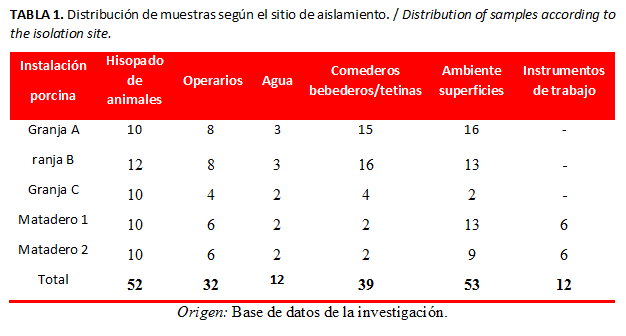 Las muestras se colectaron por personal del laboratorio del Centro Provincial de Higiene, Epidemiología y Microbiología de Matanzas, siguiendo las recomendaciones para recogida, transporte y conservación de muestras (15,22). Se estimó un tamaño de muestra de 200, con una precisión de 5 %, nivel de confianza de 90 % y una prevalencia del 30 % (19). Las 200 muestras se distribuyeron en hisopados rectales de animales, de tetinas/bebederos, comederos, superficies ambientales, operarios e instrumentos de trabajo por cada instalación porcina (granjas y mataderos). Se colectaron muestras de agua (de tanques de alimentación y del pozo que abastece a cada una de las instalaciones) (Tabla 1).