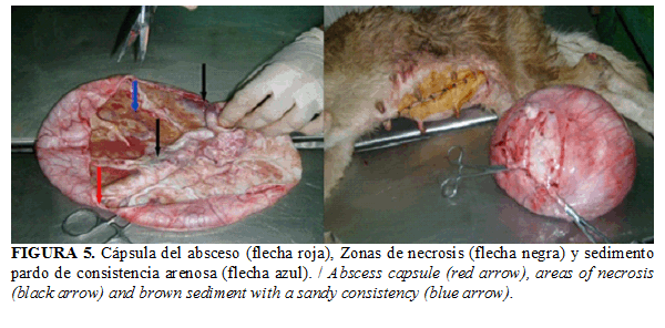 El absceso tenía un diámetro de 68 cm y un peso de 1,4 kg (Fig. 5); al incidir sobre el mismo se encontró una cavidad llena de pus, no existía estructura anatómica semejante al riñón, solo un sedimento de color pardo y consistencia arenosa en forma de riñón y zonas de necrosis y hepatización en la cara interna de la cápsula (Fig. 5).
