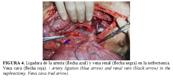 En tal circunstancia se realizó la nefrectomía, según la técnica descrita, así como las consideraciones posquirúrgicas en pacientes nefrectomizados (1). Se realizó enjuague peritoneal con solución salina a 37 Co y adición de Hibitane acuoso (antiséptico); además, se realizó ovariohisterectomía.