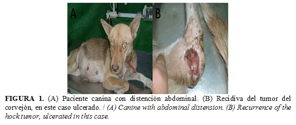 Se observaron mucosas pálidas, disnea inspiratoria, frecuencia cardiaca de 130 pulsaciones por minutos, rápida y superficial; además presentaba hipotermia (37,5oC) y ganglios inguinales y poplíteos aumentados de tamaño, de superficie lisa y ligera sensibilidad dolorosa. La región del corvejón izquierdo presentaba un aumento de volumen en el mismo lugar del tumor extirpado anteriormente (Fig. 1). Asimismo, se observó distención abdominal (perímetro de 76 cm) (Fig. 1), con ligera sensibilidad dolorosa y consistencia de pastosa a fluctuante, palpándose una masa abdominal de forma ovoide y grande. Posteriormente se decidió realizar una laparotomía exploratoria.