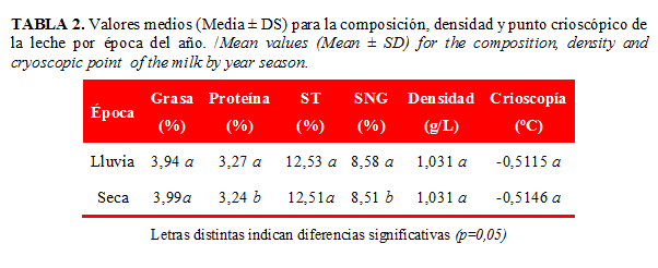 Se observa que los componentes proteína y sólidos no grasos mostraron diferencias significativas (p<0,05) de acuerdo a la época del año. Los contenidos de proteína y de sólidos no grasos fueron superiores durante la época de lluvia, lo que coincide con lo descrito por otros autores (12,17). Este resultado puede explicarse por la relación existente entre estos componentes y la producción láctea, que tiende a aumentar en el periodo lluvioso debido a una mayor disponibilidad de alimentos y a una mejor calidad de los mismos.