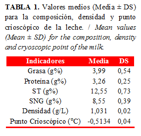 El contenido de grasa, proteína, sólidos totales y sólidos no grasos se comprobó por espectrofotometría infrarroja utilizando el equipo MilkoScan-Minor-6A/S Foss Electric, Denmark, aprobado por la Federación Internacional de Lechería (7). El punto de descenso crioscópico de la leche se determinó con el empleo del crioscopio Funke Gerber® (8) y la densidad mediante lactodensímetros de Quevenne, acorde a lo descrito en la norma NC 119: 2006 (9).